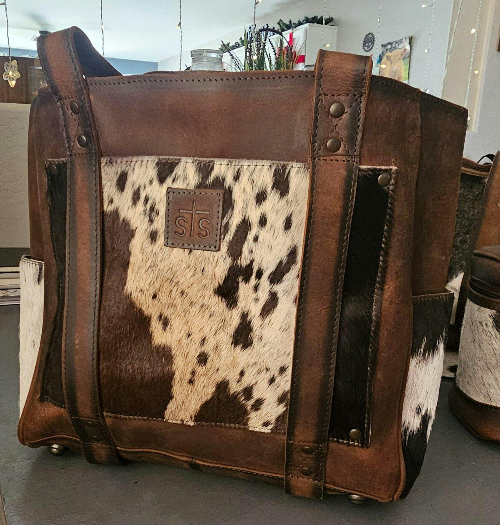 The Cowhide Trinity Tote is made from hand selected hair on hide with genuine full grain leather accents.