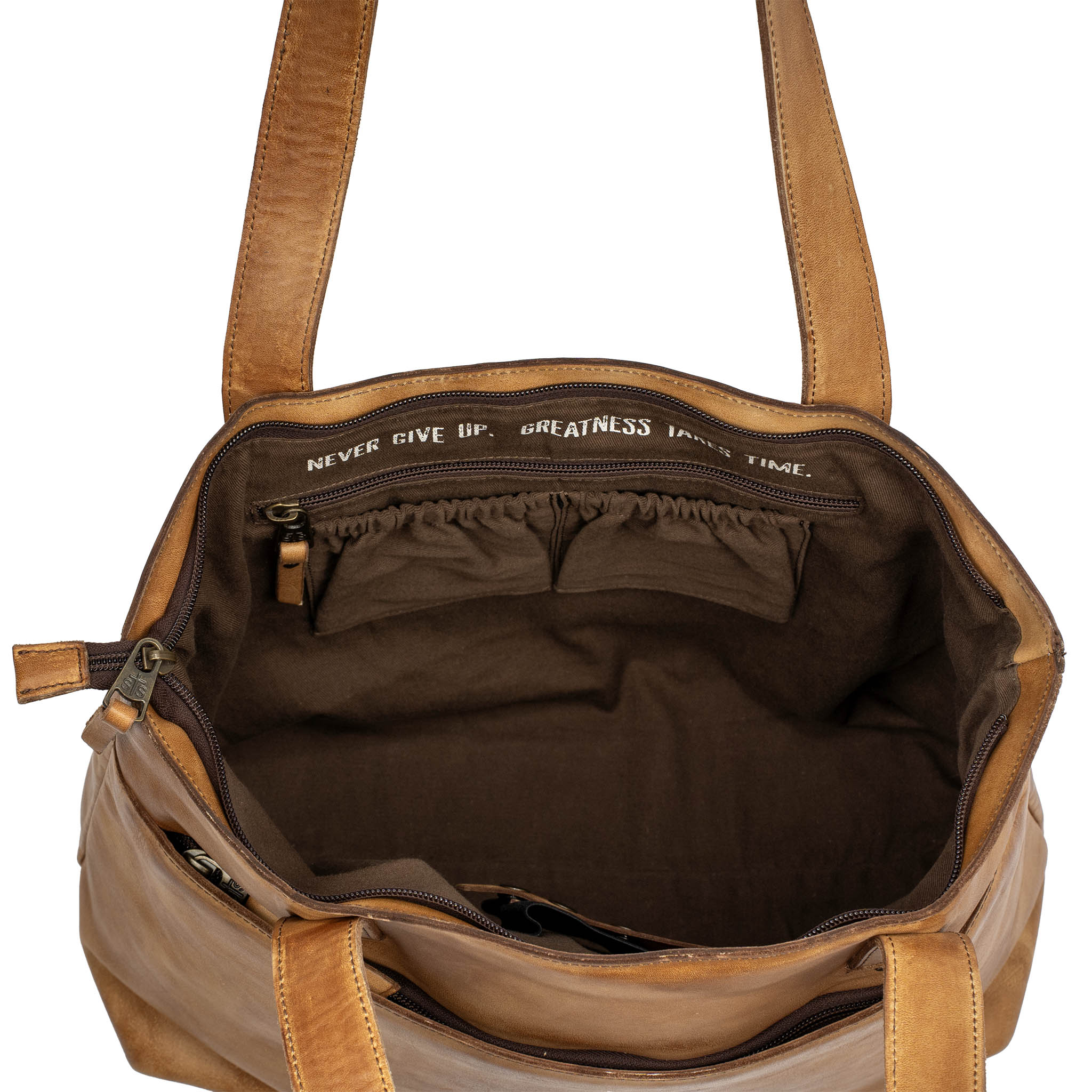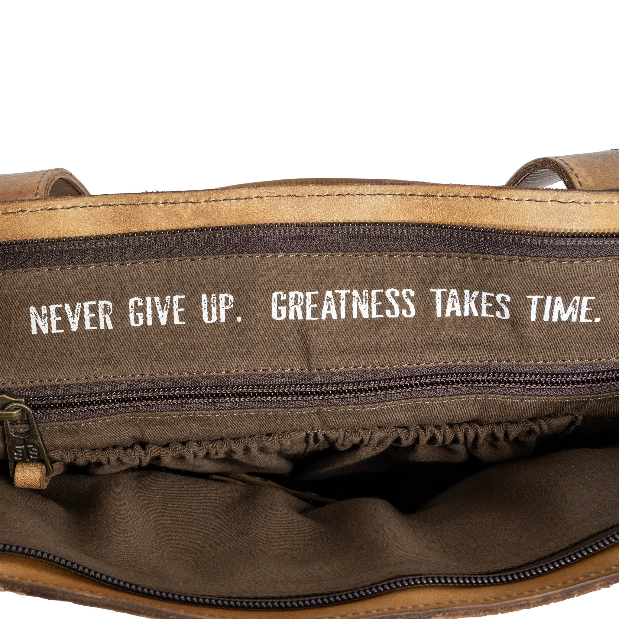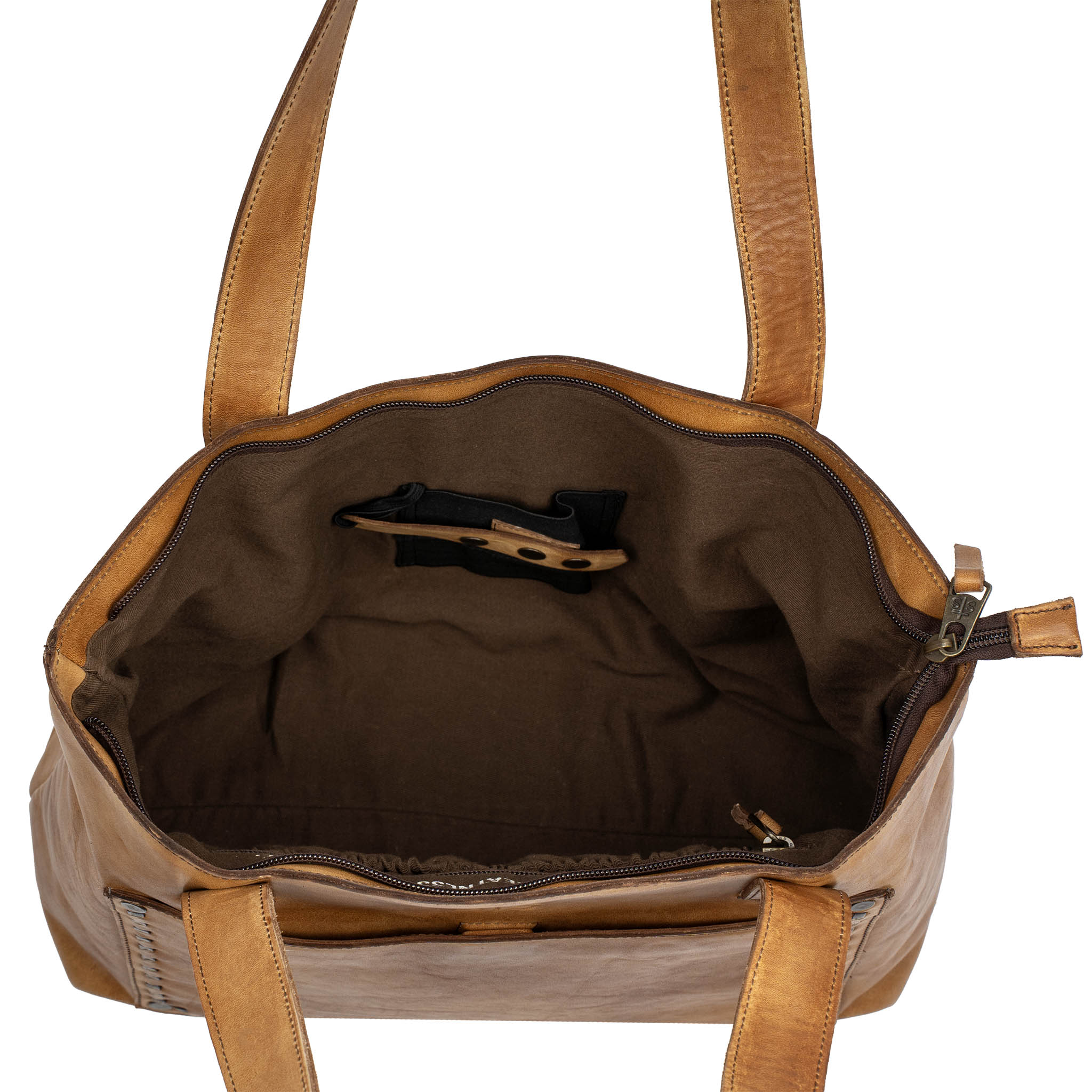 The Bandera Tan Simple Tote is an everyday staple item made of full grain leather elevated by beautiful stitching and adorned with STS stamped leather. This functional leather piece with ample storage is a must have for any collection.