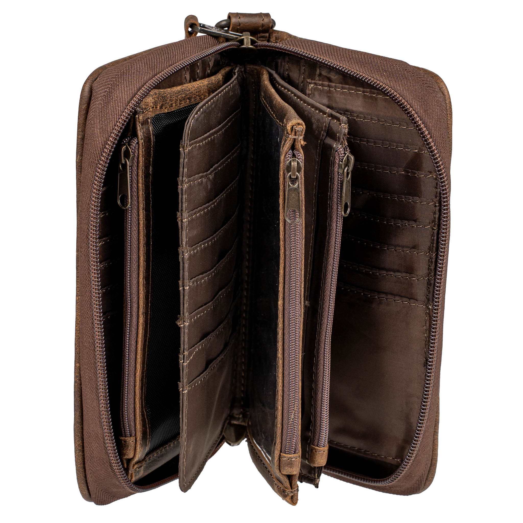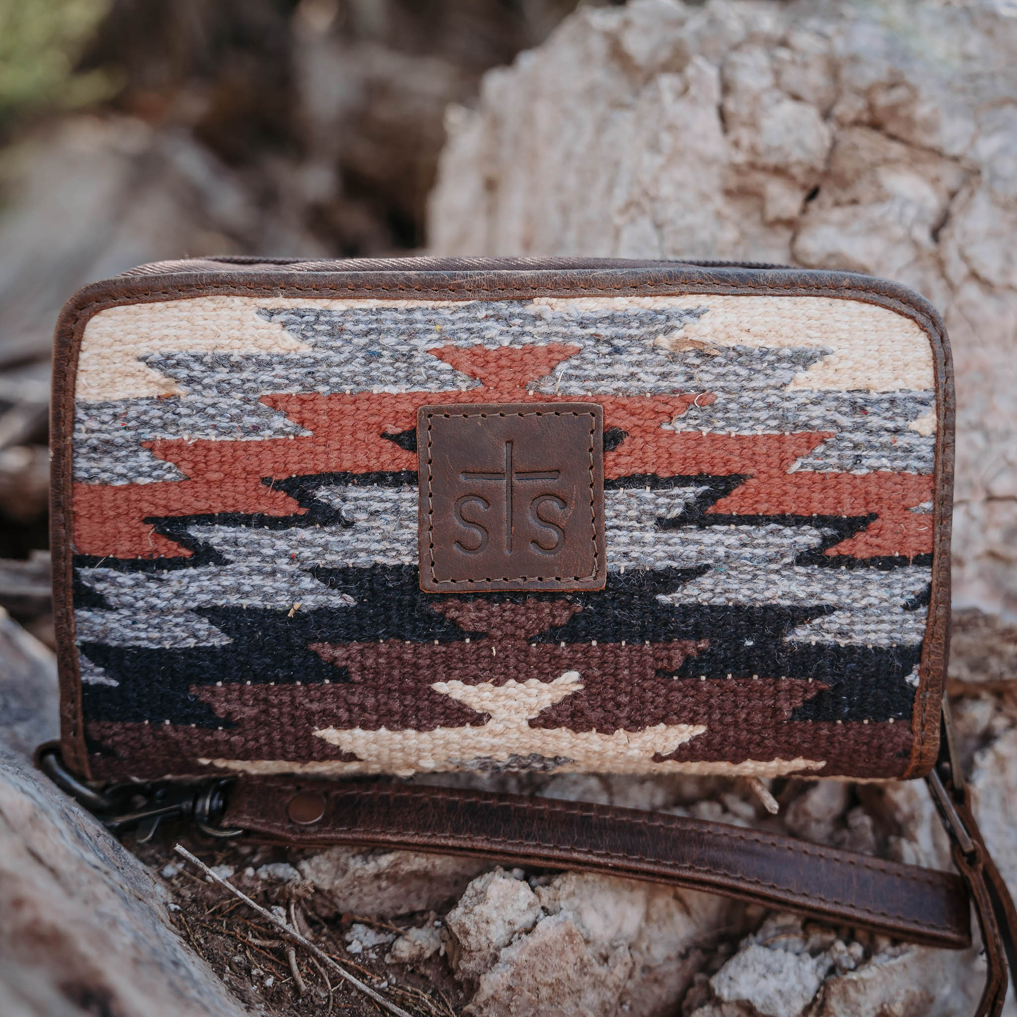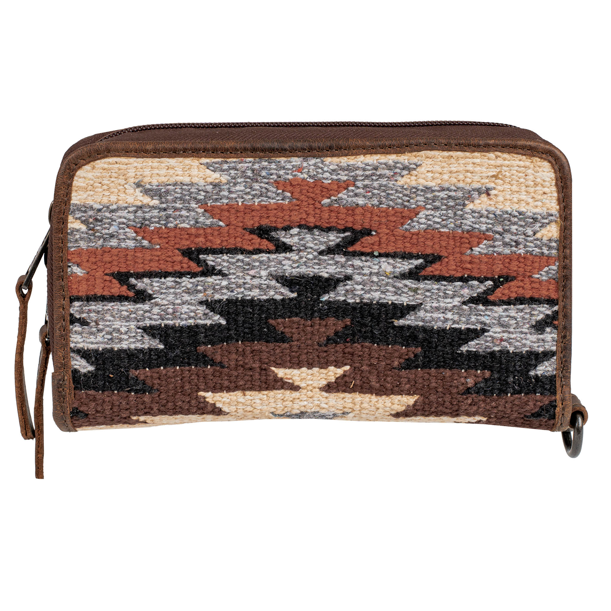 The Guadalupe Serape Kacy Organizer captures the essence of fall with its rich palette of browns, creams, grays and black colors and is crafted from hand-woven cotton with full grain leather accents for a timeless rustic charm.