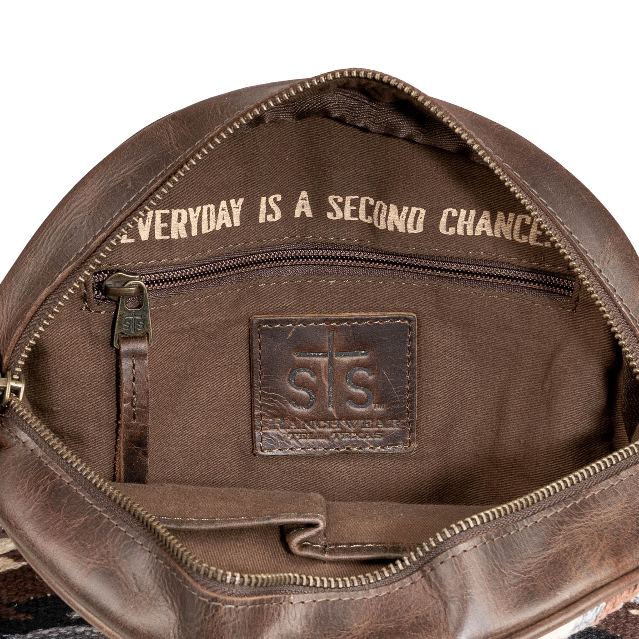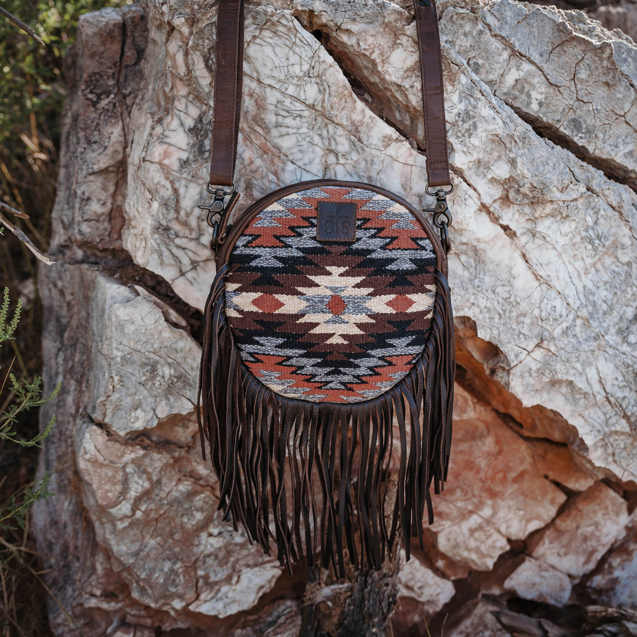 The Guadalupe Serape Sage Crossbody captures the essence of fall with its rich palette of browns, creams, grays and black colors and is crafted from hand-woven cotton with full grain leather accents for a timeless rustic charm.