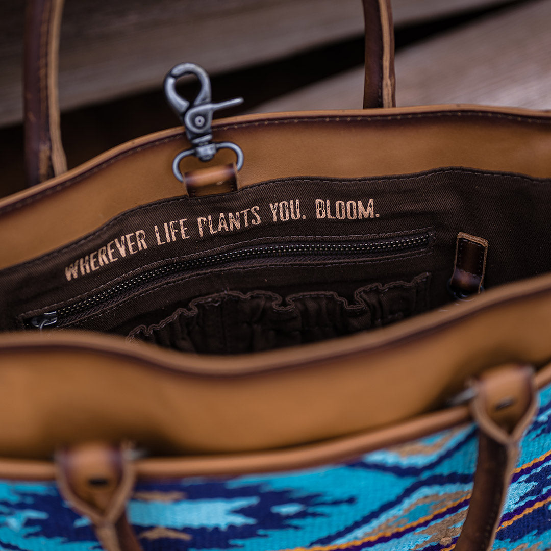 The Mojave Sky Satchel is inspired by the desert sky. This bright turquoise and blue woven serape collection creates an irresistible appeal that is accented by classic aztec patterns and hand distressed full grain leather.