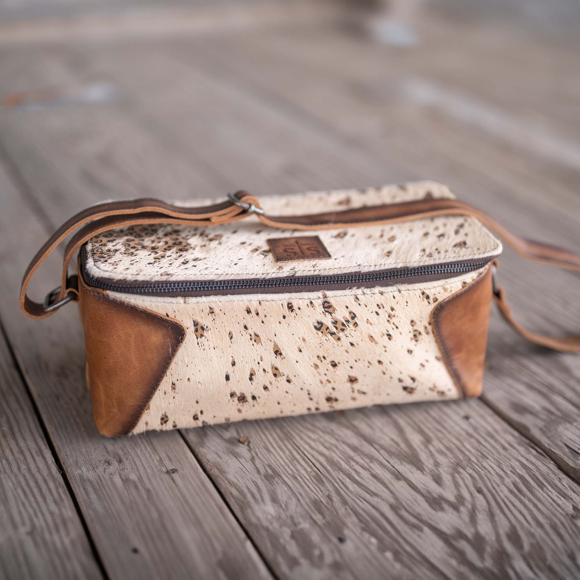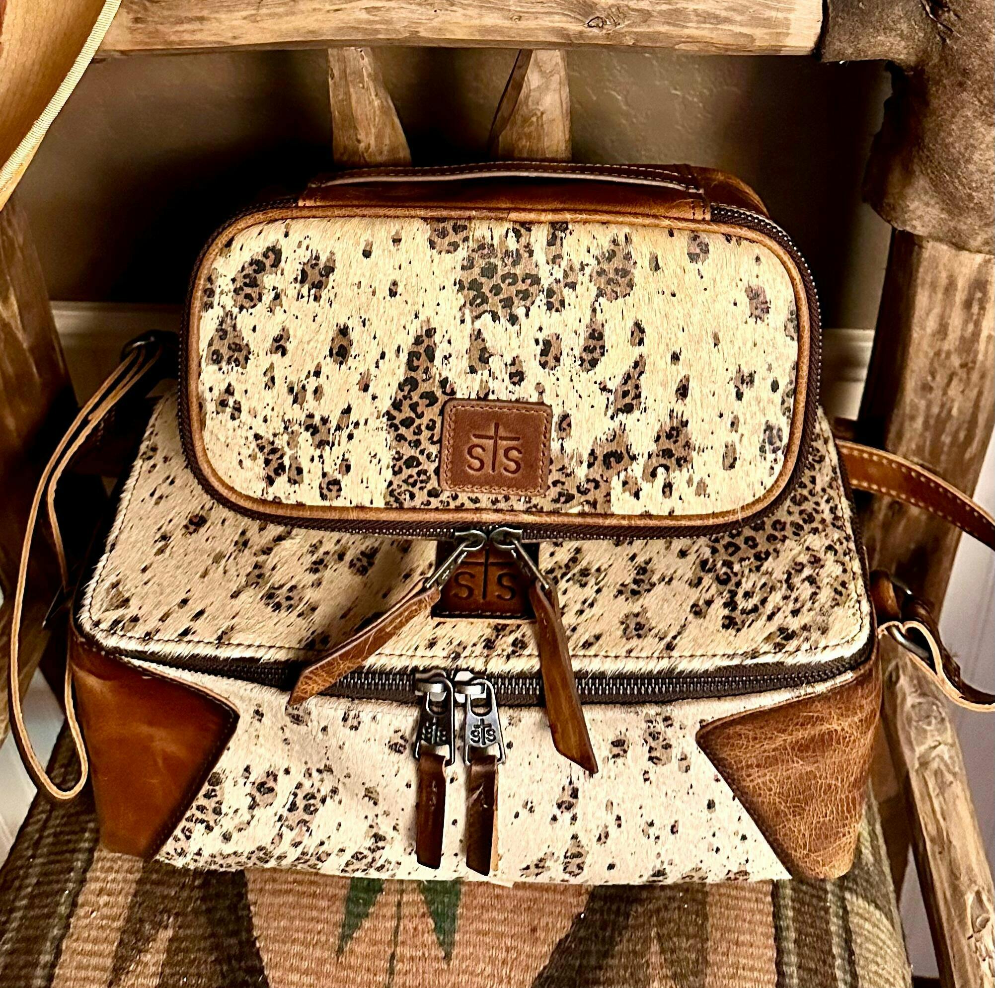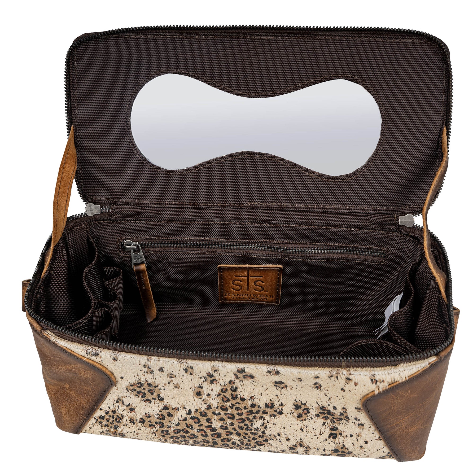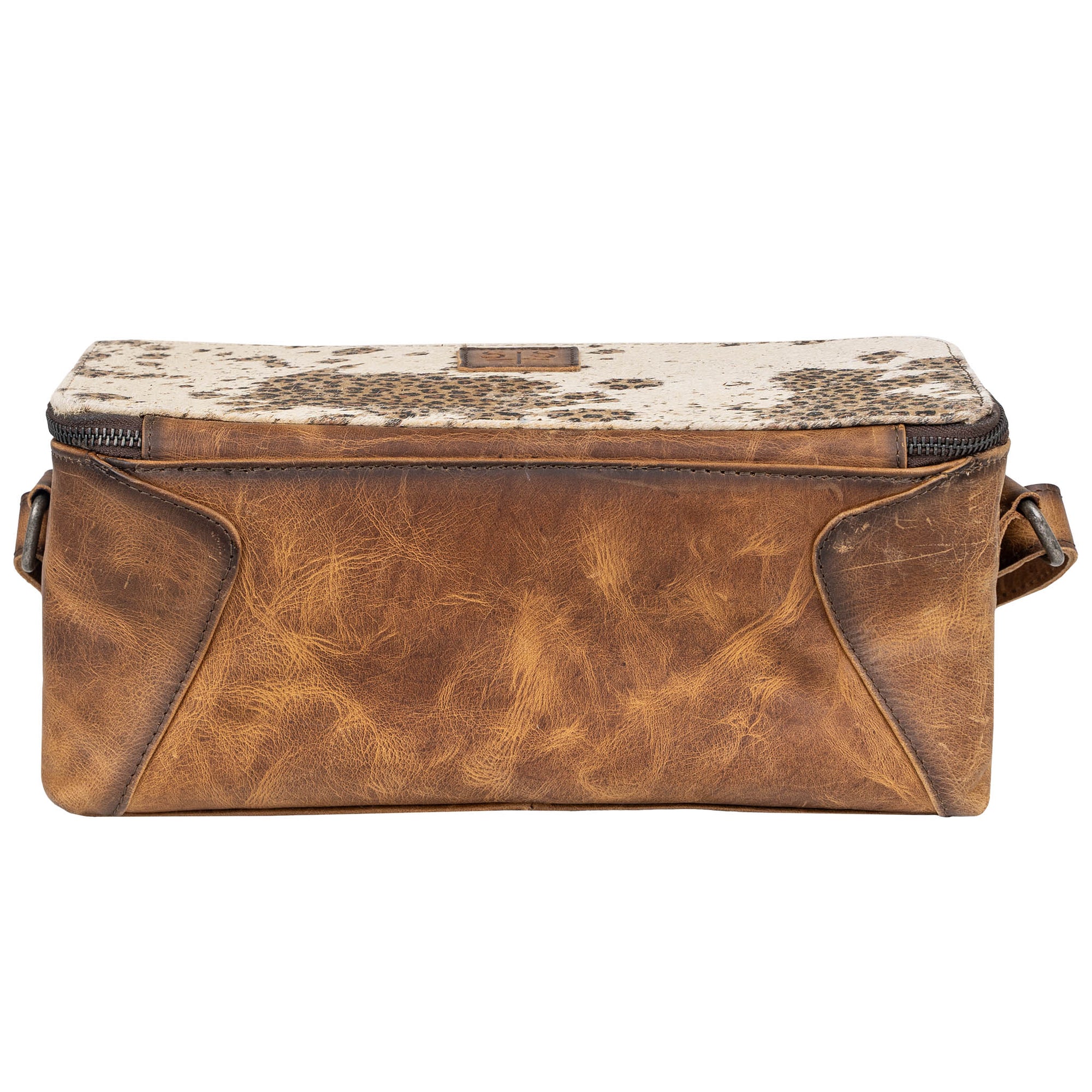 The Serengeti Maddi Makeup Carry All features a unique baby leopard print scattered throughout hair-on-hide cowhide. Finished with a distressed full grain buckskin leather and large rustic conchos, this collection is a "must-have" of the season.